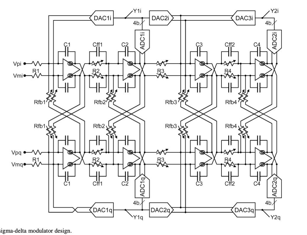 Now we have a continuous time sigma delta with two stages. First stage is a integrator (R1 and C1), and second stage is a filter (Cff1, R2 and C2). The amplified and filtered signal is sampled by the ADC1i and fed back to the input DAC1i.