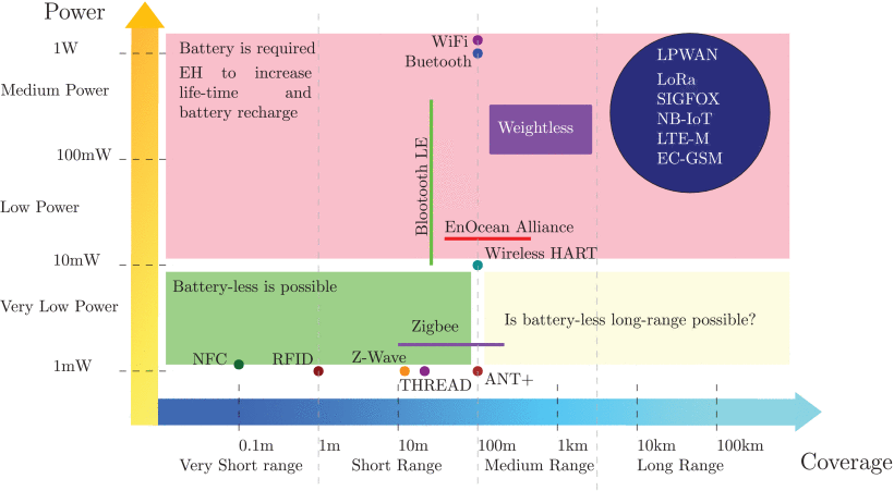 Other standards, like Bluetooth, WiFi, LTE are harder to run battery less, because the energy requirement above 1 mW.