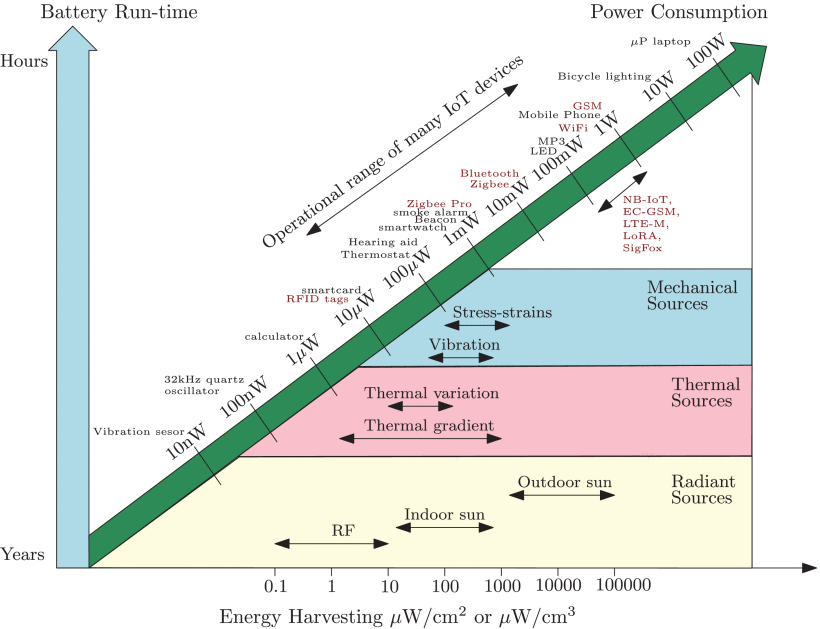 Towards a Green and Self-Powered Internet of Things Using Piezoelectric Energy Harvesting [1] has a nice overview of power consumption of technologies, seen in the next figures below.