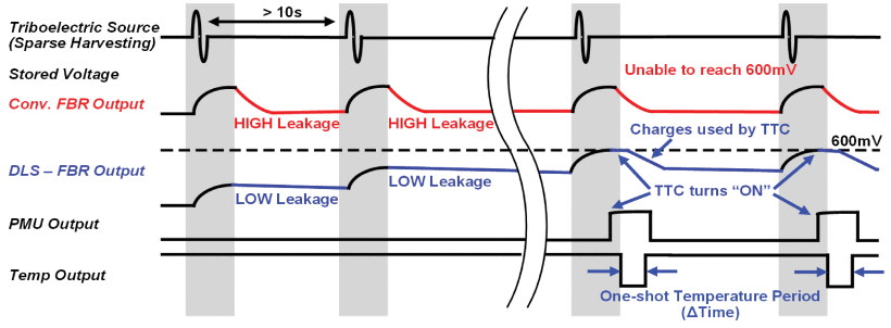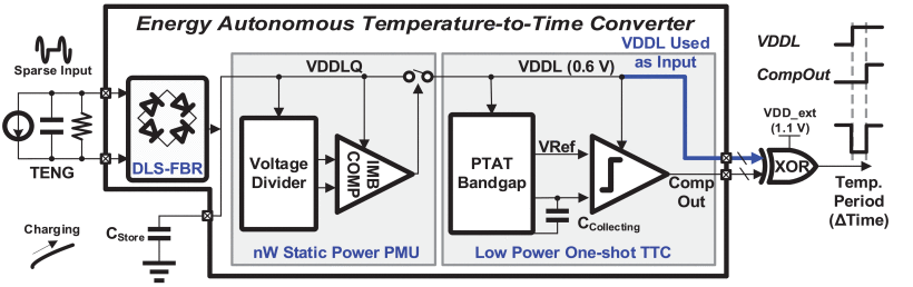 Below is some more details on the operation of the harvesting circuit, and the temperature sensor. Notice how the temperature sensor part of the circuit (PTAT bandgap, capacitor and comparator) produce a pulse width modulated signal that depends on temperature.