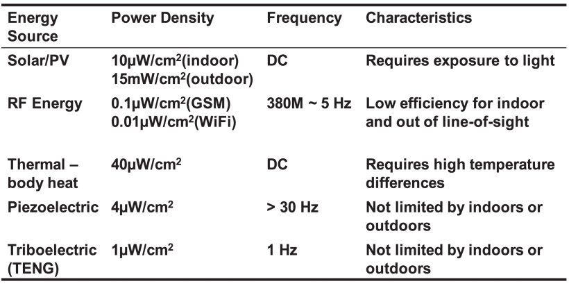 Thermoelectric and photovoltaic provide low DC voltage. Piezoelectric and Triboelectric provide an AC voltage. Ambient RF is stupid.